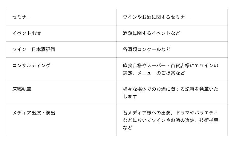 イベントや試飲会への出演・セミナー、販促コメント制作、コラボ商品の開発、ディレクションからブランドアンバサダーまで幅広く業務を承ります。お仕事例