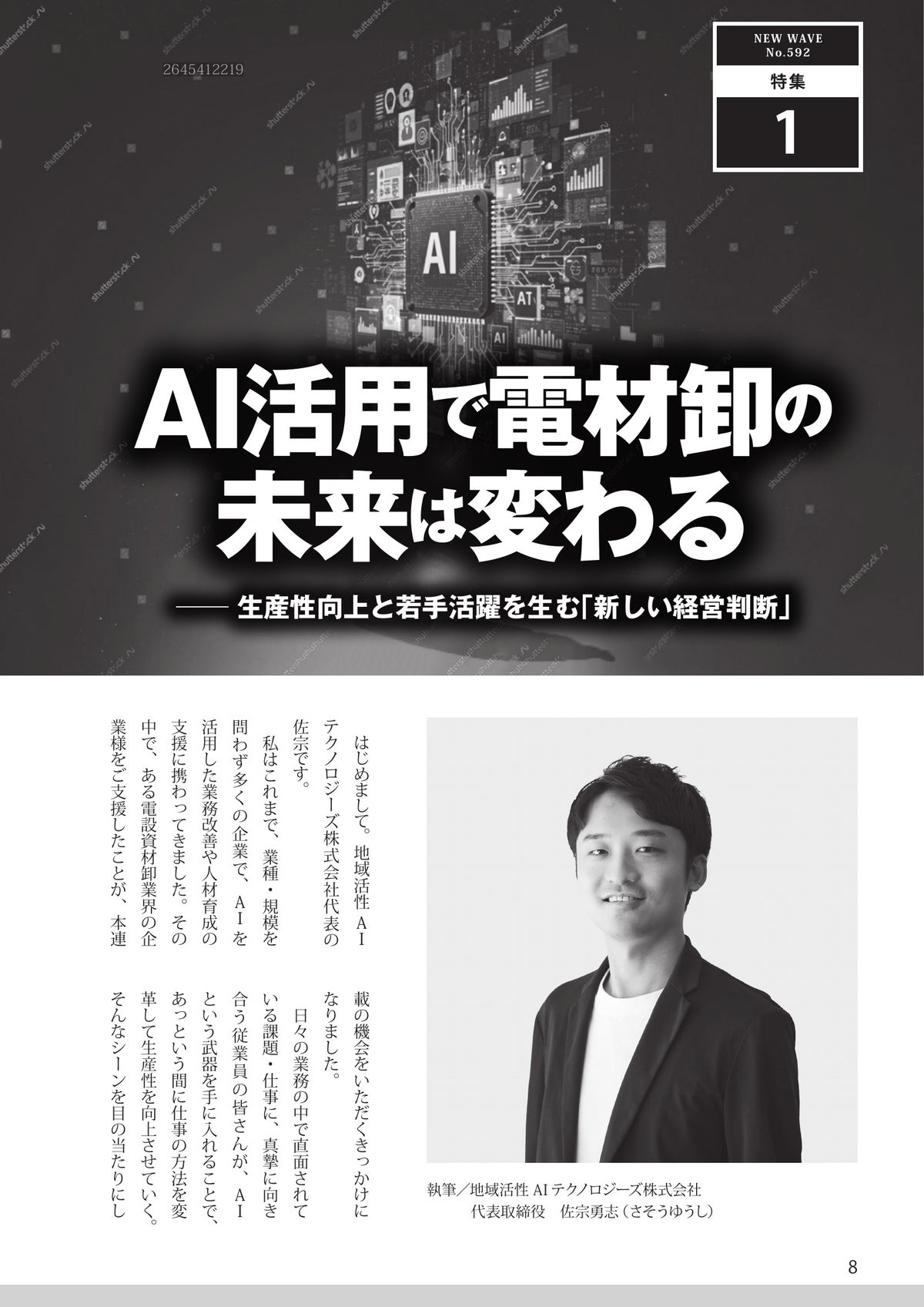 株式会社フューチャーリンクネットワーク(本社:千葉県船橋市、代表取締役:石井丈晴、以下FLN)の子会社である地域活性AIテクノロジーズ株式会社(本社:千葉県船橋市、代表取締役:佐宗勇志)は、全日本電設資材卸売業協同組合連合会が発行する機関誌『NEW WAVE』において、代表・佐宗による3カ月連続の巻頭特集連載「AIがつくる“次の電材業界”」が掲載されることをお知らせいたします 。