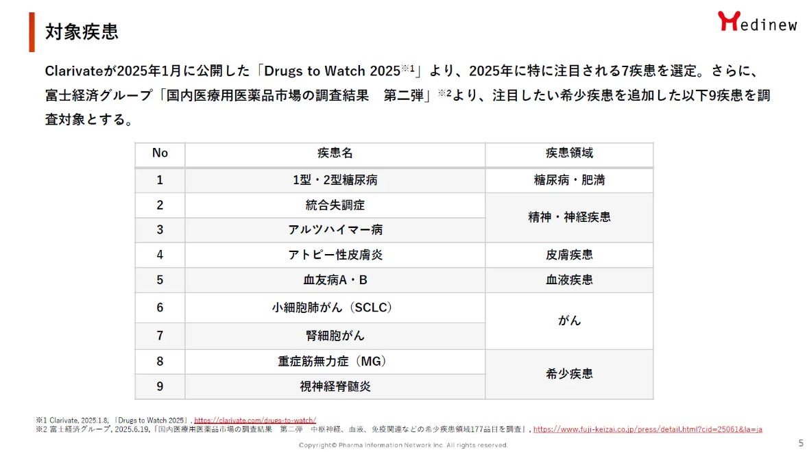 調査対象|Medinewが選定した9疾患×製薬企業医薬品市場統計売上上位20社 ※一部疾患は上位20社以外の企業も調査