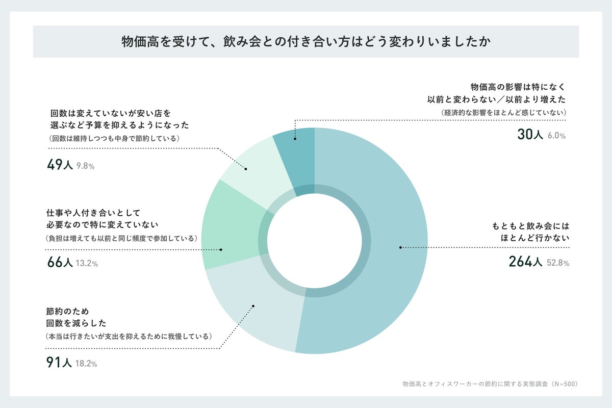 物価高の影響を受けても以前と変わらない、または増えたという人は30人に留まっており、飲み会に対してもシビアな取捨選択が行われています。