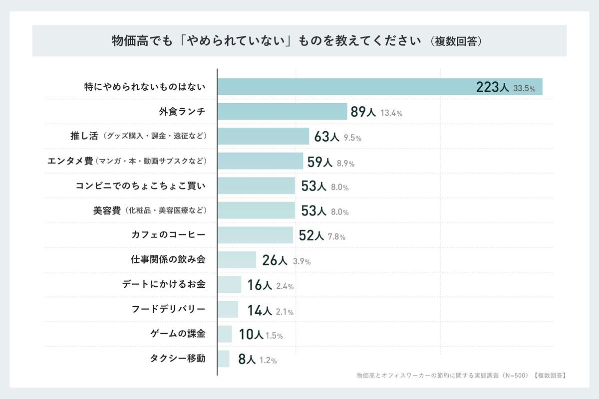 一方で、物価高でも「やめられていない」支出としては、「外食ランチ」が89人で最多となりました。次いで「推し活・オタク活動」が63人、「エンタメ費(マンガ、本、動画サブスクなど)」が59人でした。また、「美容費(化粧品、美容医療など)」と「コンビニでのちょこちょこ買い」を挙げた人がそれぞれ53人、「カフェのコーヒー」を挙げた人が52人、「特にやめられないものはない」は223人となりました。