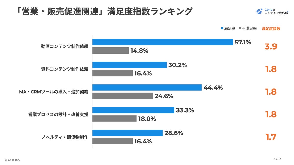 まず目を引くのが動画コンテンツの制作依頼です。満足率は57.1%と、営業施策の中で最も高く、不満足率は14.8%となりました。