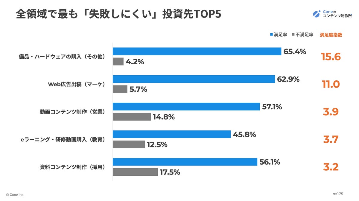 1位は備品・ハードウェア購入(満足度指数15.6)となりました。不満足率は4%台にとどまり、期待値とのギャップが生まれにくい、極めて安定した投資先であることが分かります。