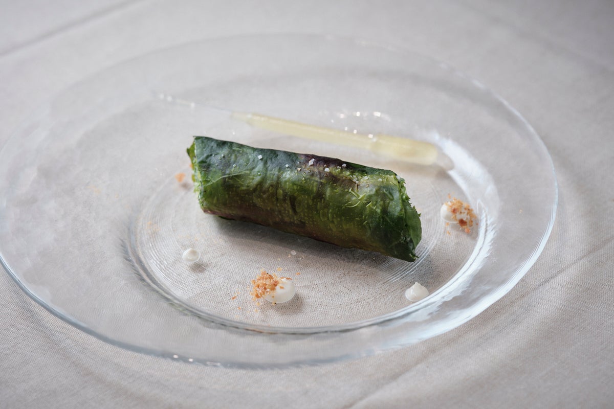 この世界観にペアリングされたのが、野田シェフによる「大都市のシーザーサラダ」です。 PLANTX社が生産する水光栽培のレタスや、野菜の端材を再利用したシートが使われており、野田シェフは「どんな環境下でも 食を未来に繋ぐ、再生(リジェネラティブ)への解決策。本来の素材が持つ力強い味を、一歩立ち止まって感じてほしい」と、料理に込めた革新的な意図を明かしました。