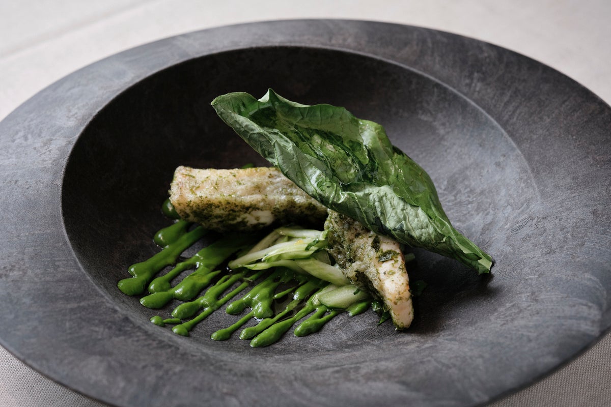 料理は、キャビア採取後に廃棄されがちな魚体に着目した「森のチョウザメ」。野田シェフは「フードロスをなくし、命をありがたく頂 くための挑戦」と語り、添えられた小松菜についても、江戸川区発祥のお野菜と東京の地産地消を守る高倉農園さんの情熱を 伝えました。 合わせたワインは、エメラルド色に輝く「ヴィーニャ・エスメラルダ」。