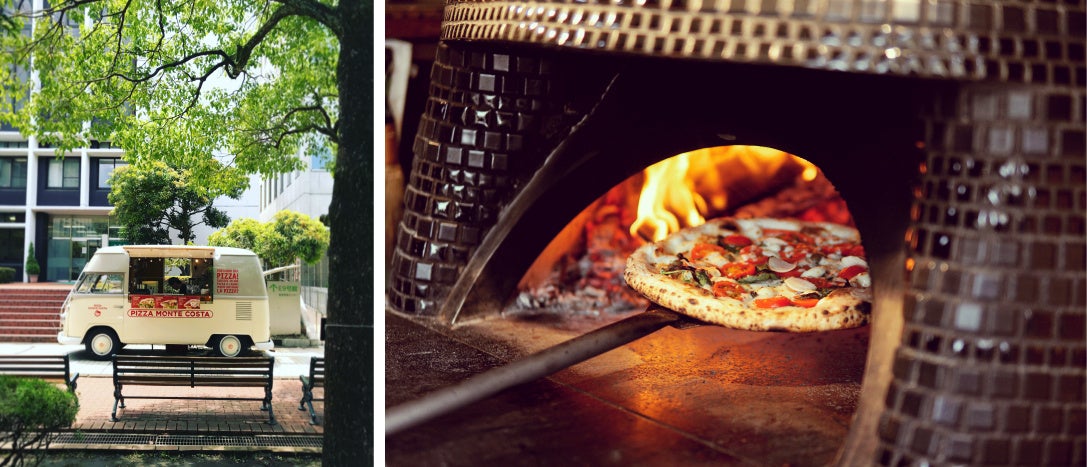 クラシックカーであるVWバスに本格的な薪窯を載せたキッチンカー。