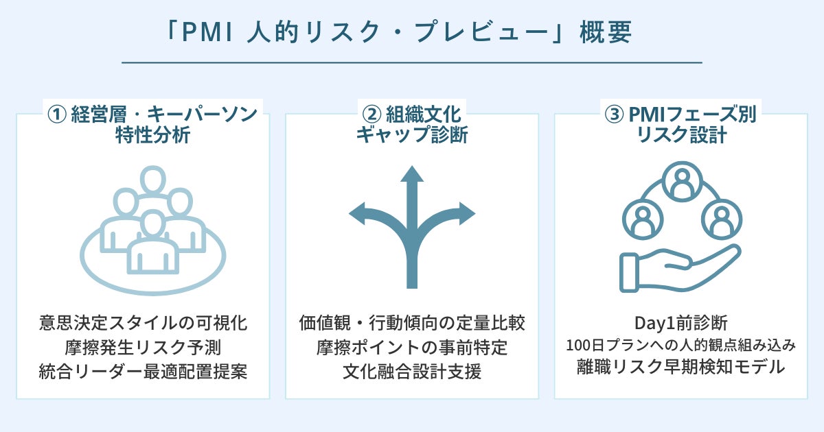 さらに、Day1(統合初日)前の診断や、統合後100日プラン(100日プラン)への人的観点の組み込み、離職リスクの早期検知モデルの構築など、PMIのフェーズに合わせたリスク設計を一貫して提供します。