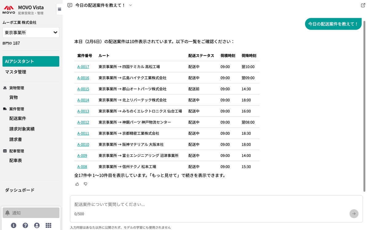 データの力で物流課題を解決する株式会社Hacobuは、配車受発注・管理サービス「MOVO Vista(ムーボ・ヴィスタ)」において、AIアシスタント機能の提供を開始しました。本機能により、チャットで質問するだけで、配送状況を素早く把握できます。画面を遷移して検索・集計する手間を減らし、物流現場の迅速な判断と対応を支援します。