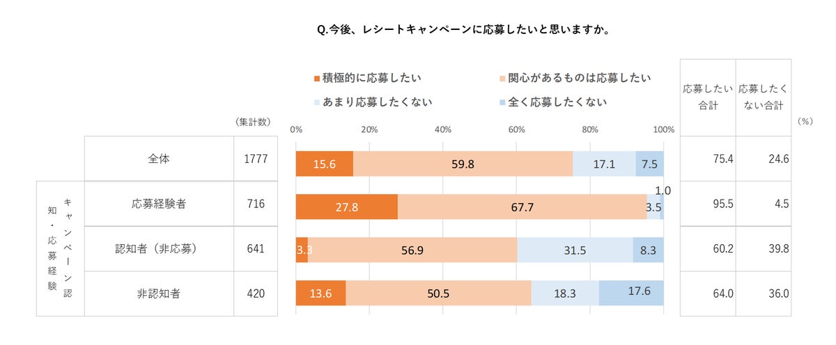 今後のキャンペーン応募意向について、全体では「積極的に応募したい」が15.6%、「関心があるものは応募したい」が59.8%で「応募したい」の合計は75.4%となりました。多くの方が、条件次第で前向きに参加を検討していることが分かります。また、キャンペーン認知者(非応募)とキャンペーン非認知者のいずれも「応募したい」の合計は60%を超えています。今後、「初めてレシートキャンペーンに応募する」という方の取り込みが、施策成果を左右するポイントとなりそうです。
