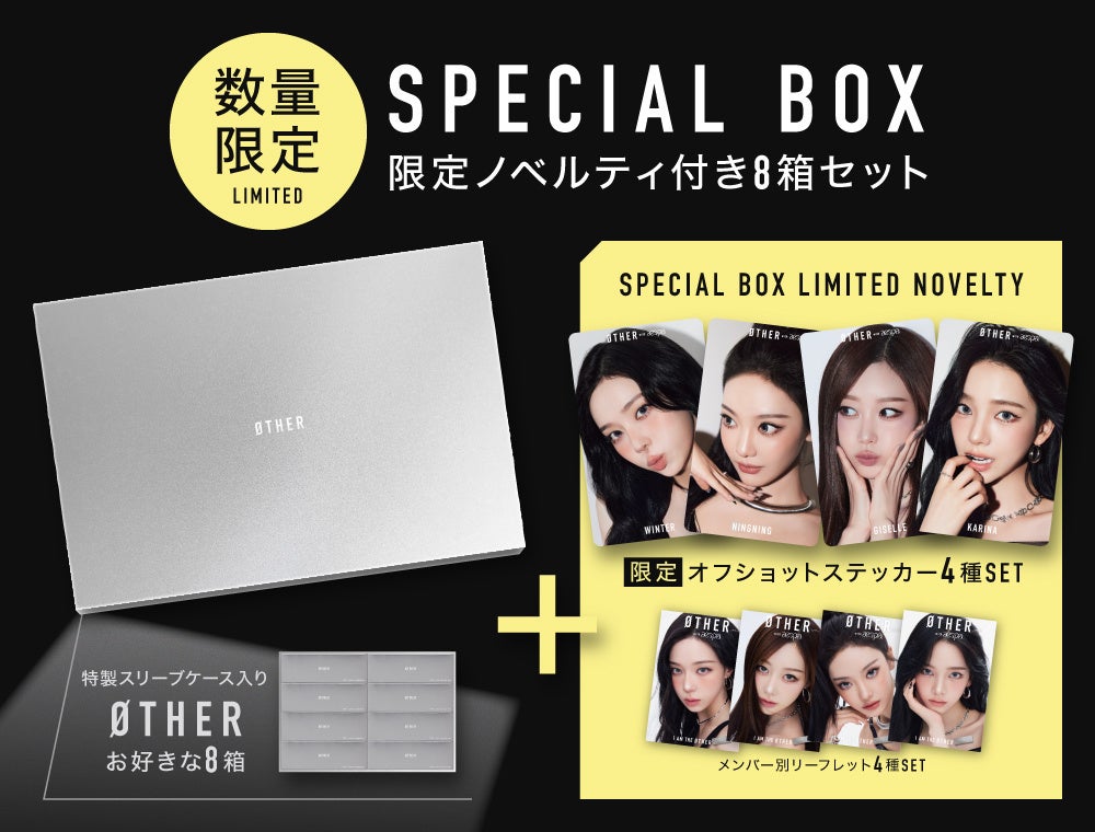 ØTHER8箱と、スペシャルボックスでしか手に入らない、ØTHERオリジナルaespaオフショットステッカー4種と ØTHER各メンバー別リーフレット4種を専用BOXに入れてお届けいたします。