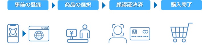 本店舗の利用者は、スマホ等で事前に専用サイトで顔情報と決済方法を登録します。店舗ではセルフ端末レジで購入したい商品を読み取り、セルフ端末レジのカメラで登録済み顔情報(顔特徴点)を照合することで本人認証を完了して決済を実施するため、手ぶらでスムーズに支払いができます。