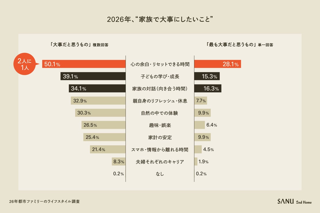 2026年、都市ファミリーの2人に1人が、家族で大切にしたいものとして「心の余白・リセットできる時間(50.1%)」を挙げ、「最も大事なもの」としても全項目で1位となりました(図1)。多くの情報や選択肢に溢れる都市生活において、「余白」を確保することは、パートナーはや子どもに対してフラットに向き合うための時間と心のゆとりをつくります。これは単なる休息志向ではなく、家族の対話や学びが無理なく続くよう、日々の暮らしの中で家庭の土台を整えたいという、所得帯を問わない普遍的な意識の表れです。