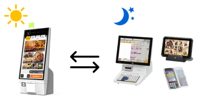 「FScompassNS」と連携し、利用中のPOSシステムやオーダー端末との併用が可能です。今後、昼は消費者が本製品を用いて注文や会計を行い、夜は店員が既存の端末を用いて注文を受けて提供できる機能や、注文のみ、会計のみ、注文と会計の両方など、店舗の運用に合わせて役割を選べるモード切替機能を搭載する予定です。店舗の業態や時間帯のごとのニーズに合わせた運用へ対応します。