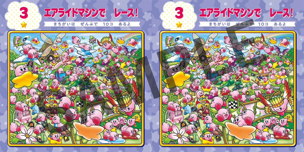 まちがいの数は全部で175コ。どのシーンも探しごたえのあるまちがいがたくさん! カービィのことが大好きなお子様から大人の方まで、何度でも繰り返し遊べる1冊です。