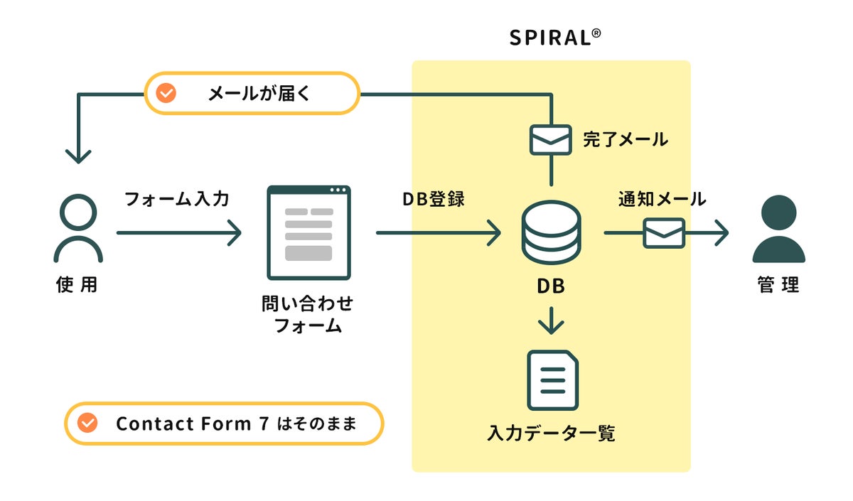 本サービスは、「Contact Form 7」と「SPIRAL ver.2」のデータベースを連携するWordPressプラグインです。 Contact Form 7で作成したフォームの構成や表示・入力項目を変更することなく、フォーム送信データをWordPress上に保持せずに「SPIRAL ver.2」で安全に管理できます。