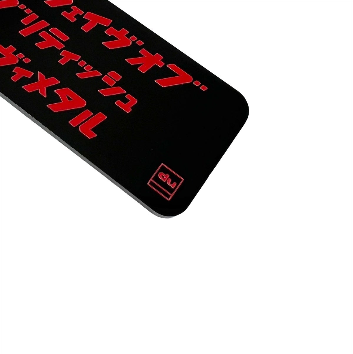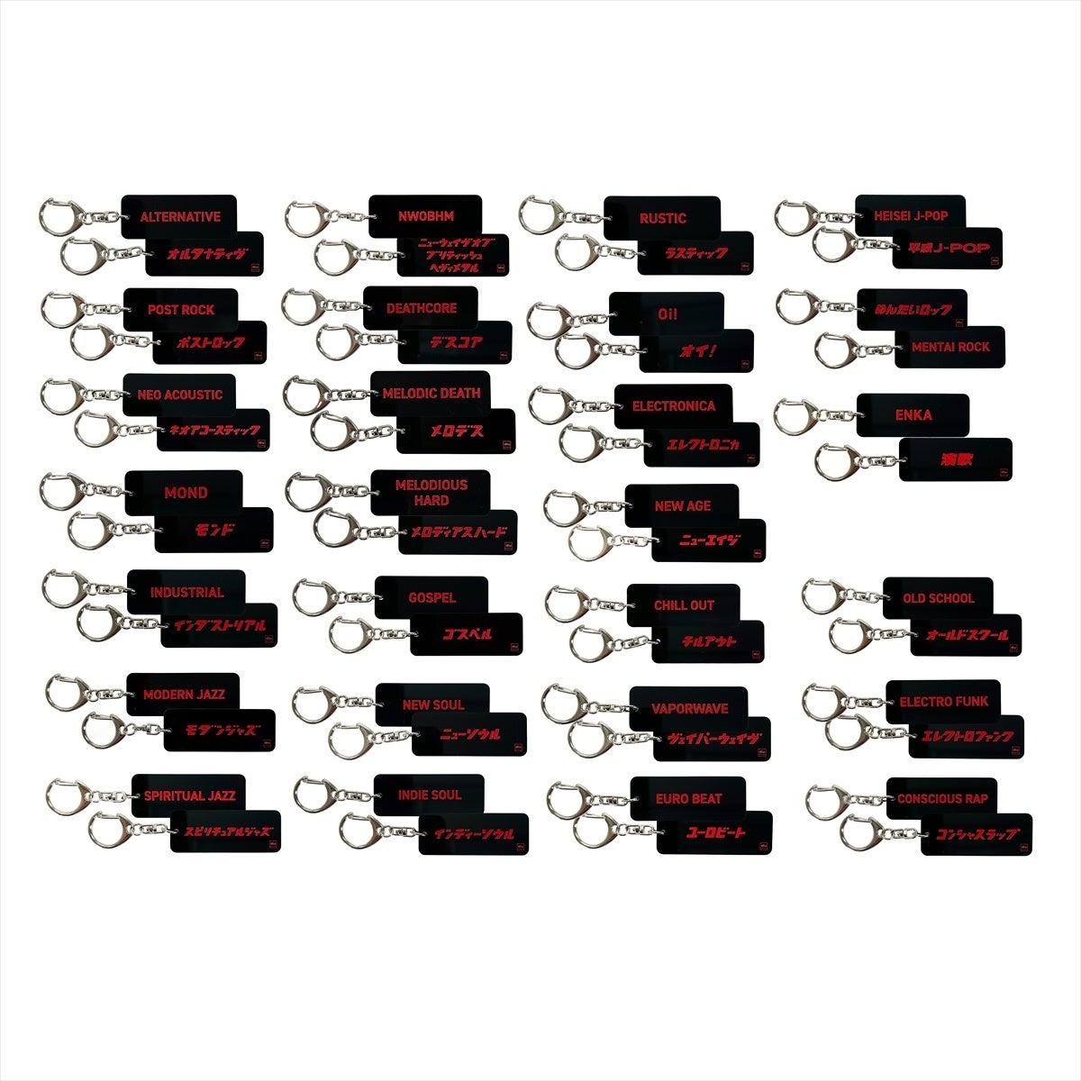 黒地に赤でジャンル名を刻んだミニマルなデザイン。主張しすぎないサイズ感と質感で、鍵やバッグにそっと添えるだけで、音楽と一緒にいる感覚を楽しめます。