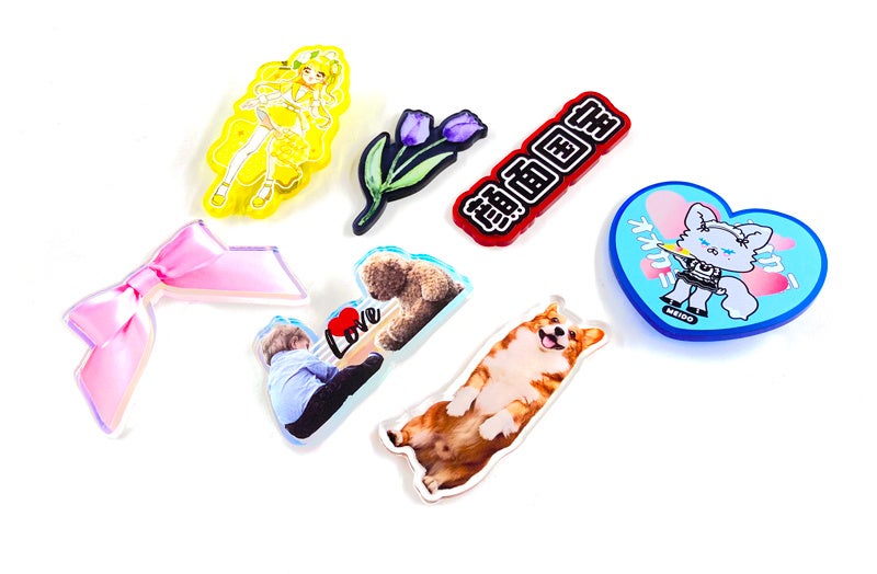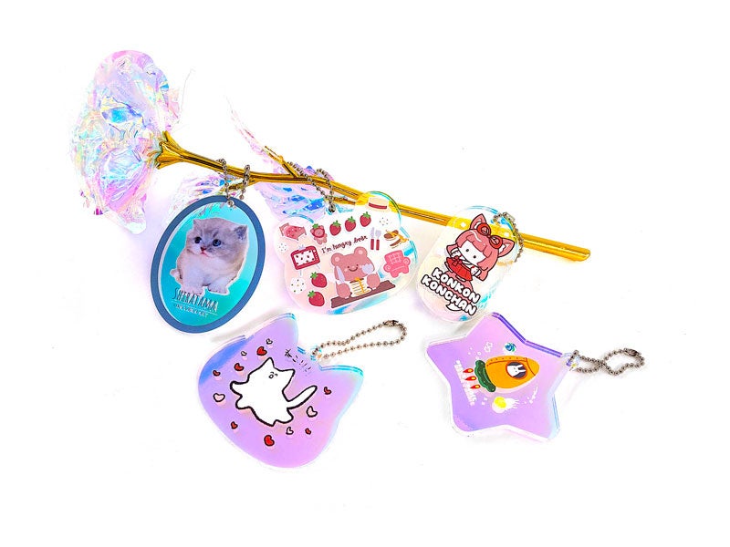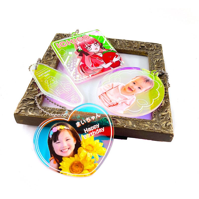 アクリルキーホルダーは、透明なアクリル板にデザインをプリントし、カット加工を施して仕上げる人気アイテム。推し活グッズや同人イベント、ショップ販促ノベルティ、記念品など幅広いシーンで活用されています。