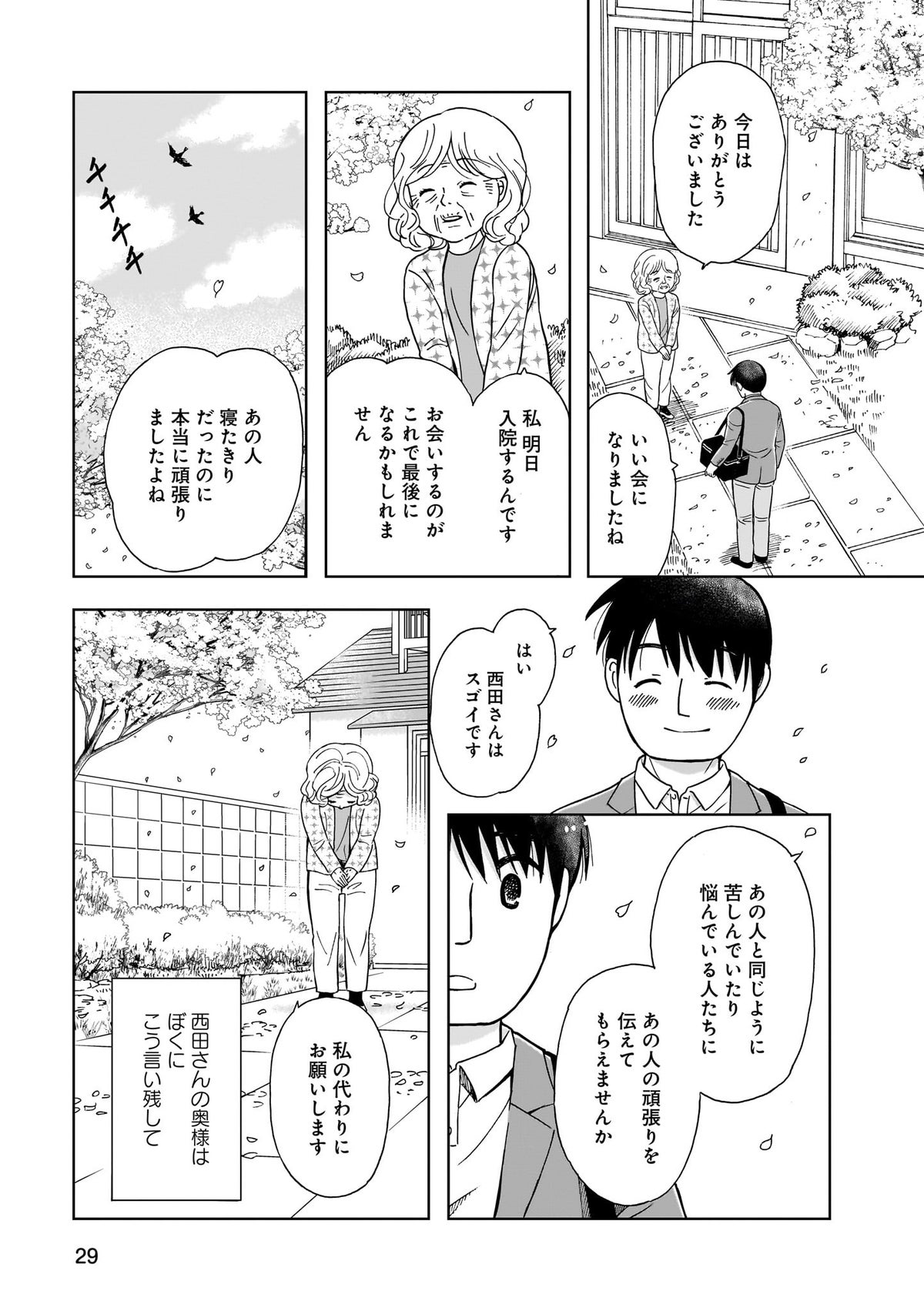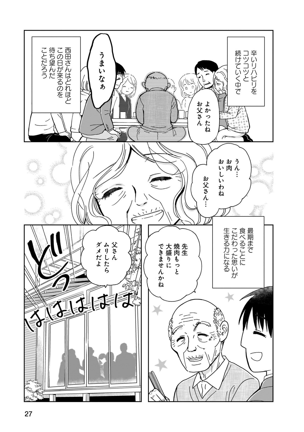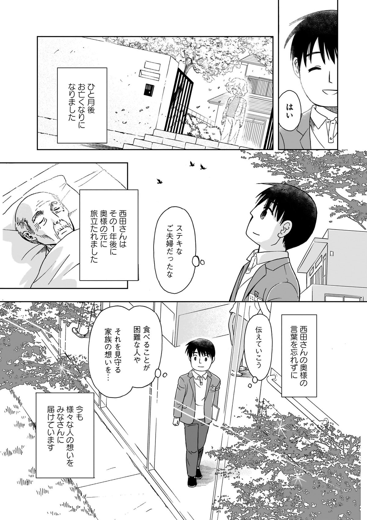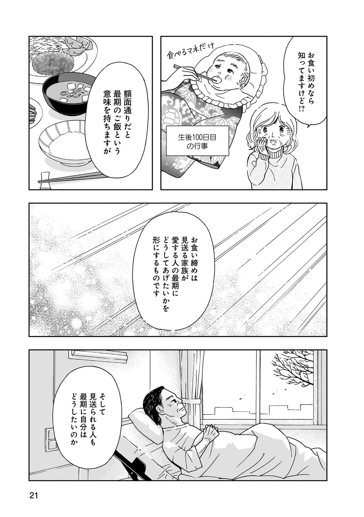お食い初めの逆となるお食い締め。狭義では最後の食事、広義では人生を締めくくる最期。口から物を食べられなくなった人のケアをする言語聴覚士の牧野日和先生が、長年経験してきた様々な人の様々な選択を漫画で紹介していく。そこには、誰とも同じではない、それぞれの人生のドラマがあり、感動がある。そんな人間の最期の選択を描くヒューマンドラマ。
