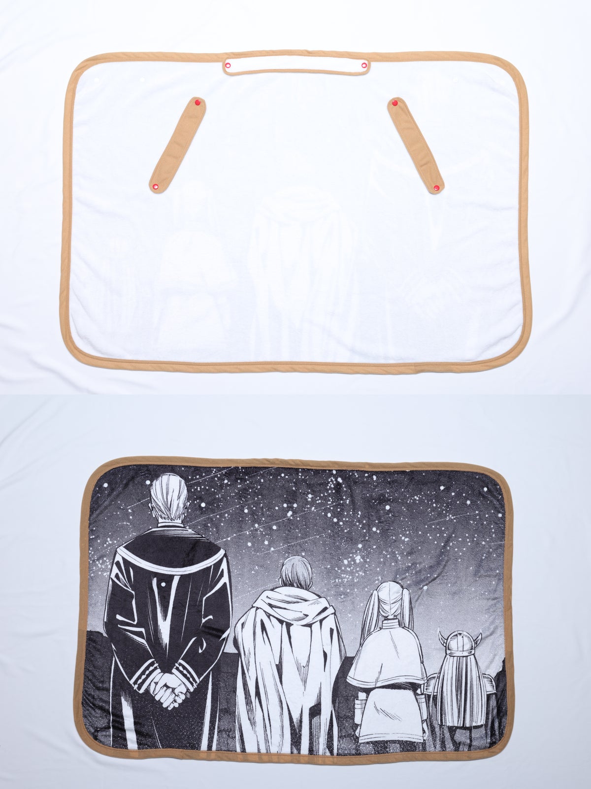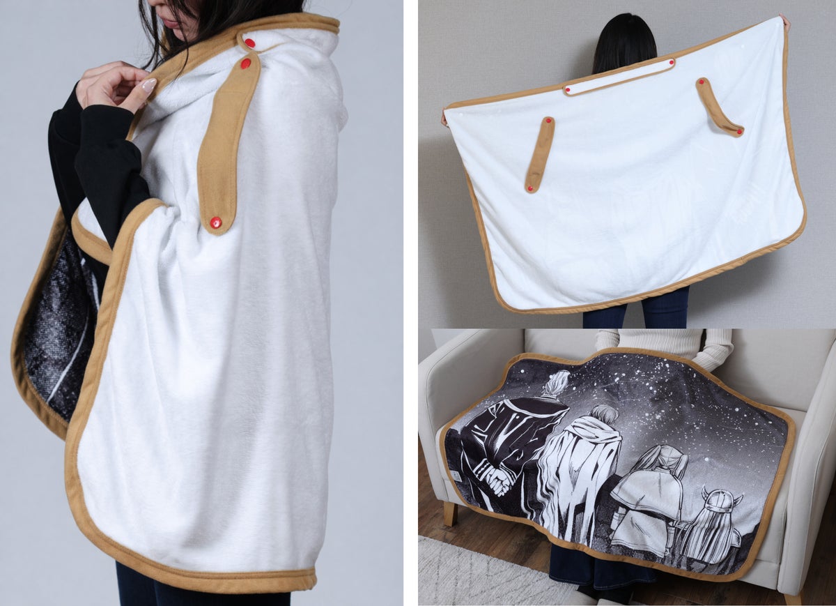 春の寒暖差から夏の冷房対策まで、季節を超えて活躍すること間違いなしの特製ブランケットです。オモテ面には勇者一行の印象的な名シーンを大胆にデザイン。羽織るのはもちろん、広げてインテリアとして飾れば、物語の余韻に浸れるスペシャルな空間が生まれます。ウラ面はフリーレンが旅路で纏うケープを再現。肩に掛ければフリーレン気分を味わえる遊び心ある仕上がりになっています。