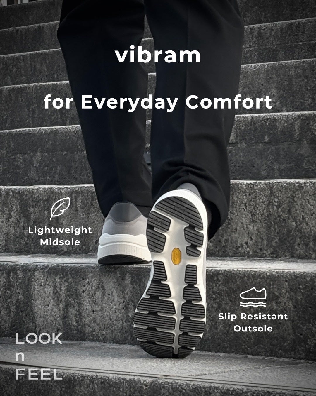 軽快な履き心地と安定した歩行性能を実現するため、ミッドソールには一般的なEVAフォームと比較して約30%軽量なvibram SLEを採用しました。軽量性とクッション性を両立し、歩行時の衝撃を穏やかに吸収します。