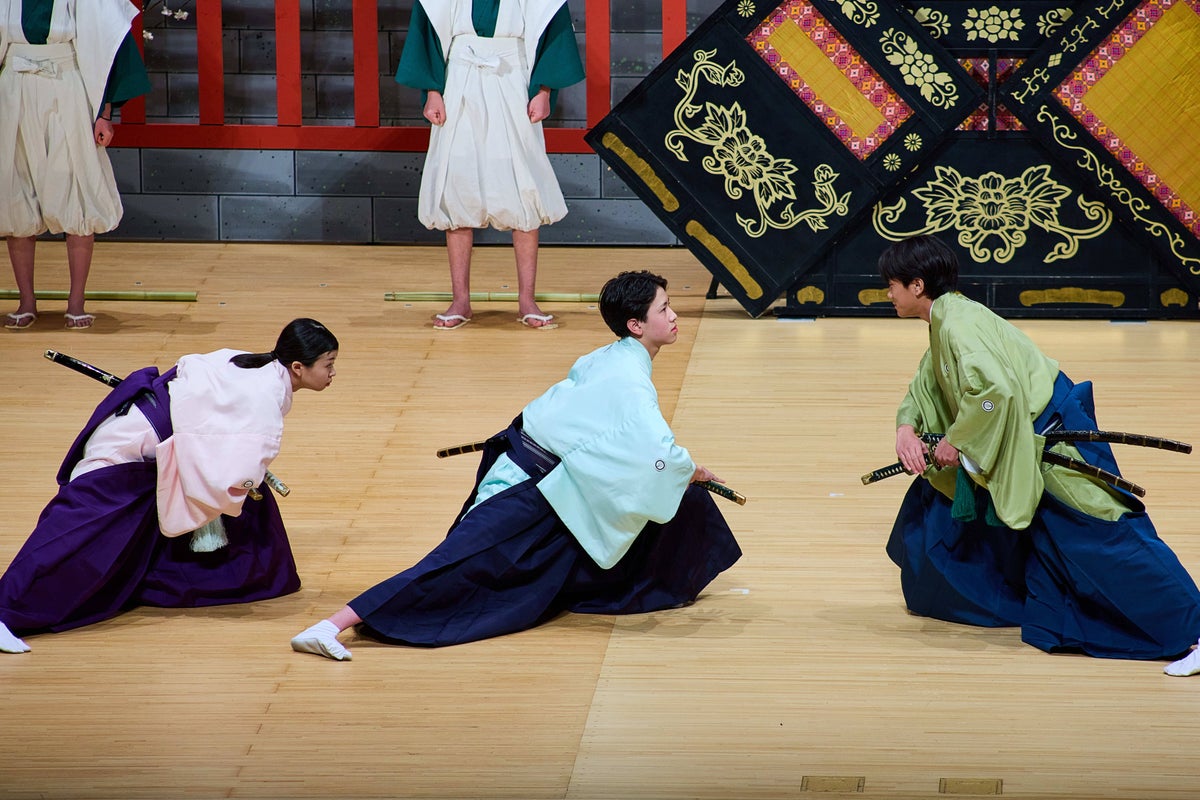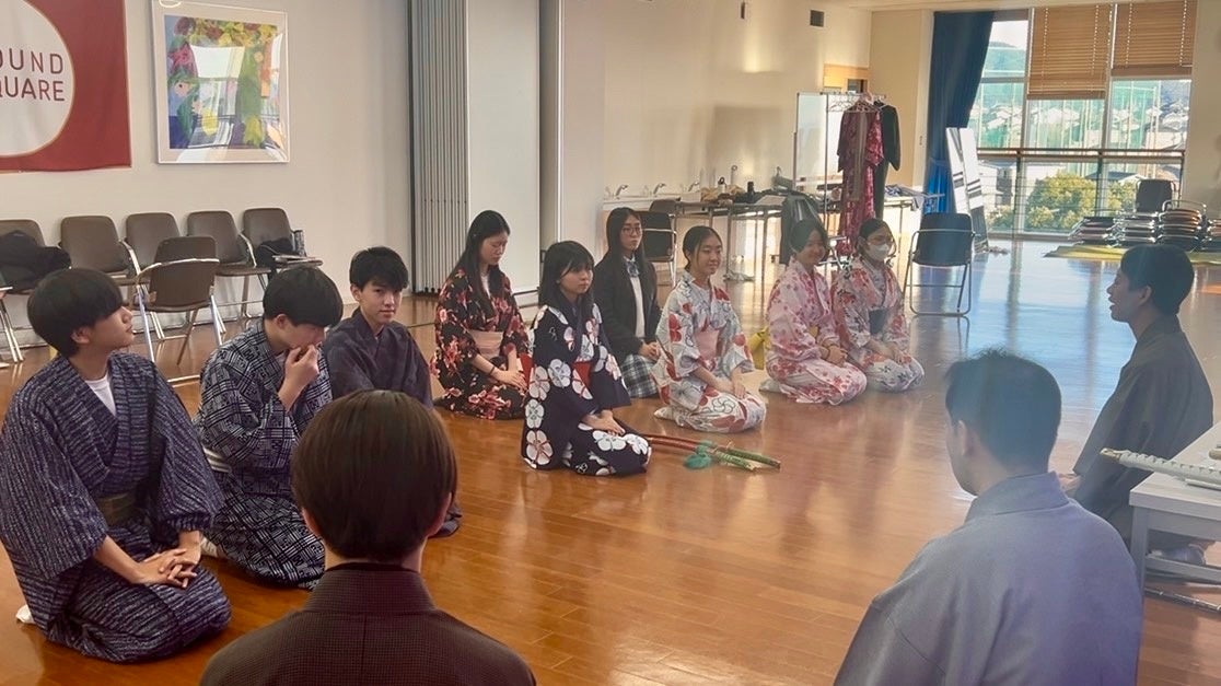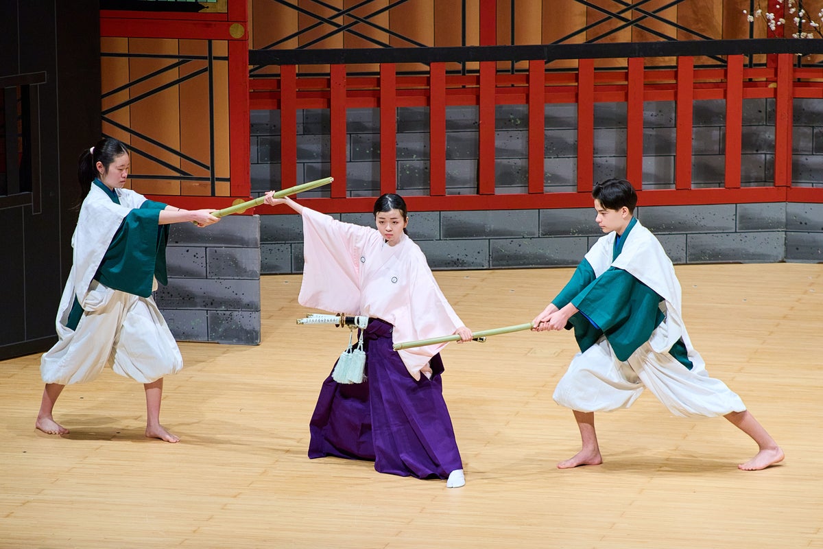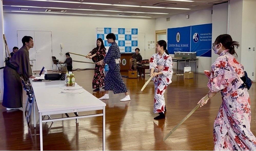 「和魂英才」の教育方針のもと、急速に変化し続けるAI時代にグローバル社会で活躍する人材育成をミッションとするリンデンホールスクール中高学部では、「和心」の会得のため日本文化や伝統の習得と理解を深めるプログラムや「茶道」等の授業を設置しています。また定期的に博多座での歌舞伎公演にも足を運び、日頃より歌舞伎への理解を深めています。2024年開学20周年記念行事では、歌舞伎俳優・中村壱太郎氏の指導のもと、株式会社ナリコマヤ・オフィス、株式会社宮本卯之助商店、松竹株式会社の協力を得、福岡アクロスホールで「全国初の中学生・高校生による英語歌舞伎」を披露。この公演がガイド連盟総会開会式で袴歌舞伎を披露するきっかけとなりました。
