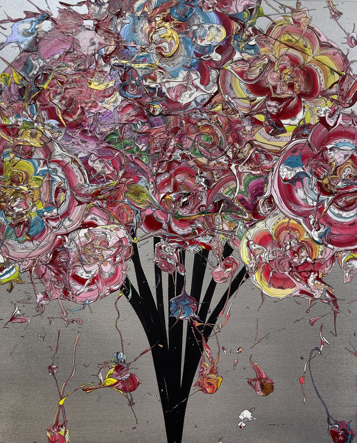 出展作品 《Abstract Bouquet 251108 (Glitter Silver x Red)》 アクリル絵の具・顔料インク/キャンバス・木製パネル, 2025 H652 x W530 x D22mm