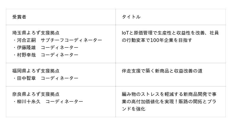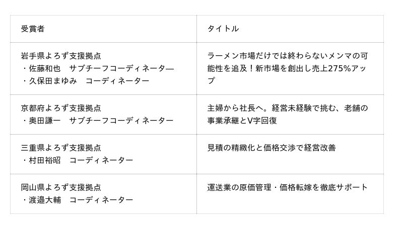 よろず支援拠点コーディネーター表彰制度 中小企業庁長官賞(成長支援事例・優良事例)の受賞者を発表します