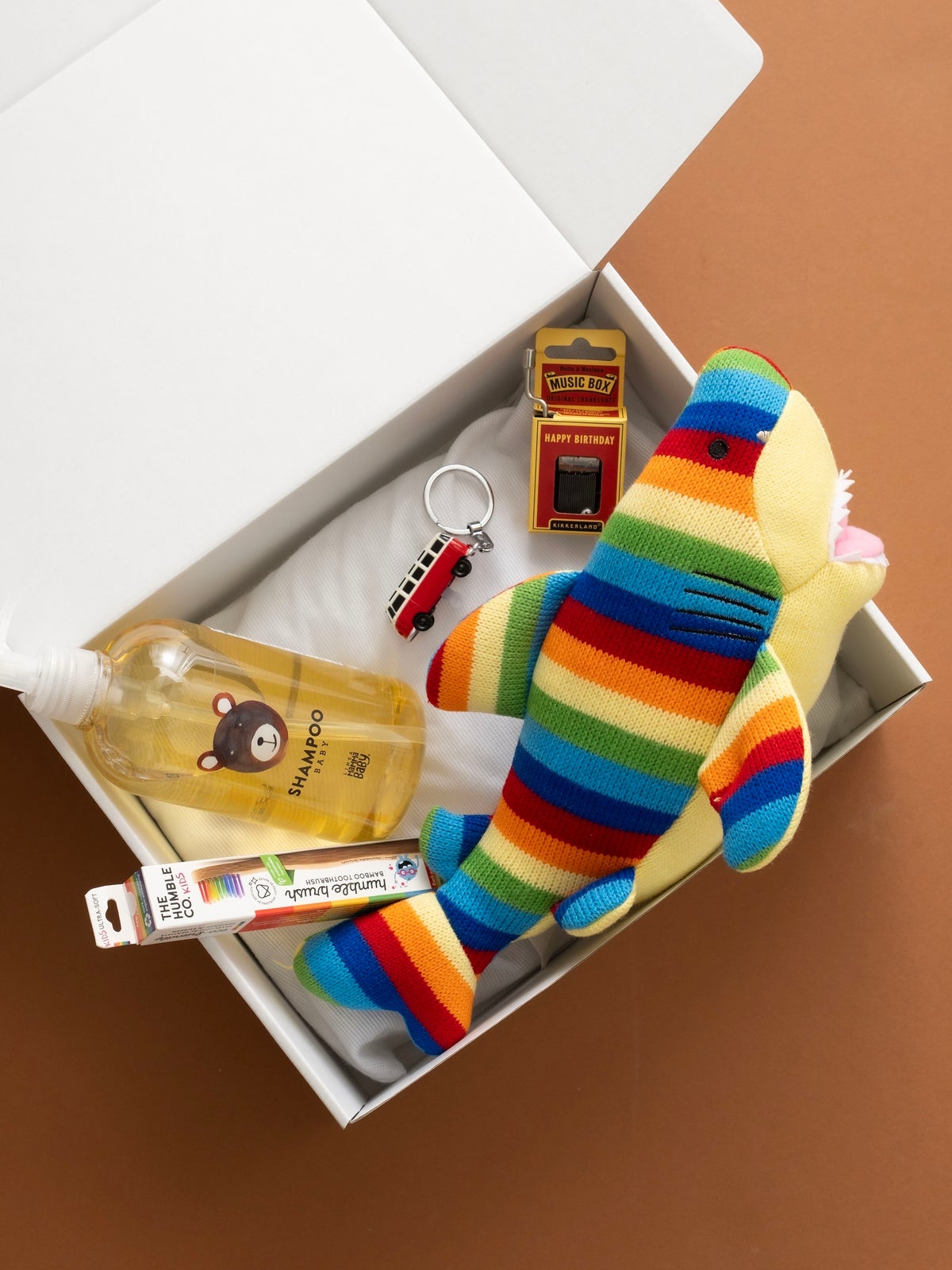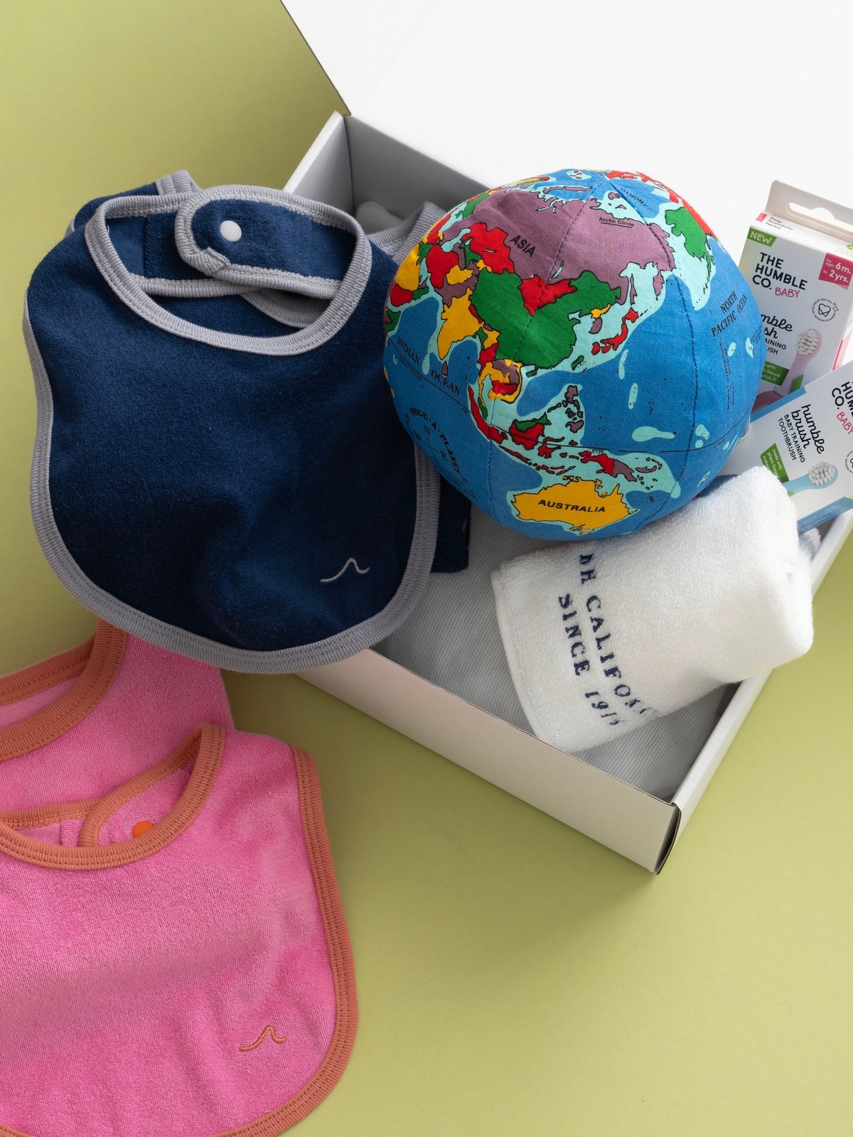 1~2歳児に向けたギフトボックスとして、オリジナルの着心地抜群のパイル素材を使用したロンパース&ビブと赤ちゃんのはじめてのオーラルケアにぴったりな、やさしさと使いやすさにこだわったスウェーデン発のTHE HUNBLE CO.(ザ ハンブル コー)のトゥースブラシをメインとしたセット。その他にアメリカのHugg-A-Planet(ハグアプラネット)より、オーガニックコットンを使用した地球儀モチーフのクッションとどんなシーンでも活躍するロンハーマンオリジナルのタオルハンカチを加え、日々の生活がより楽しく豊かになる内容に。