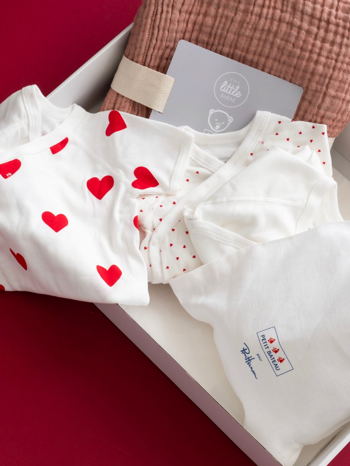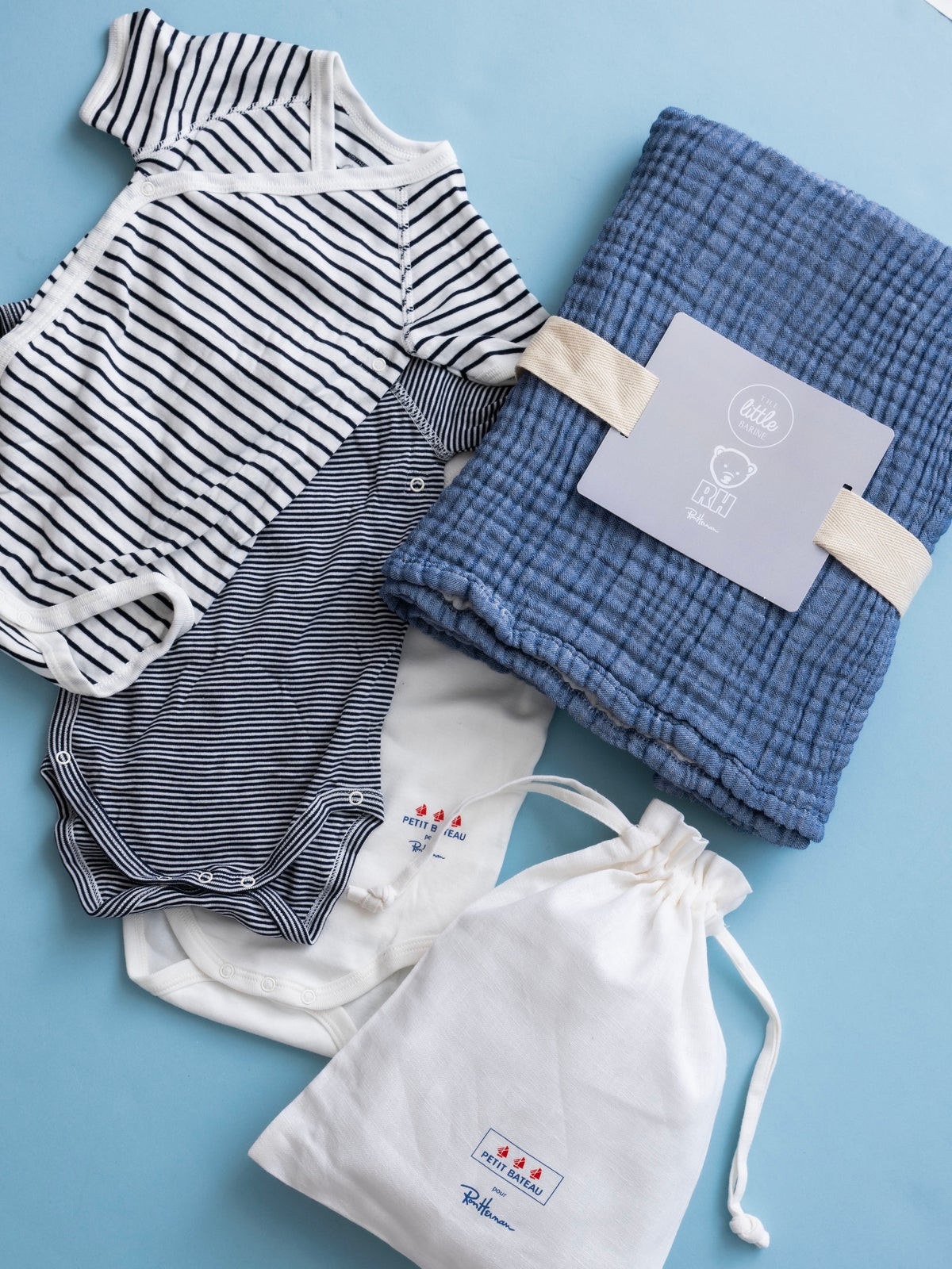 3枚セットになったプチバトーとの別注ロンパースは、ダブルネームのプリントが施された巾着がセットになっているため、おむつや替えのビブ入れとしても活用していただけます。柔らかい肌触りのバリーネのブランケットと合わせて赤ちゃんが心地よく過ごしていただける、とっておきのアイテムたちです。