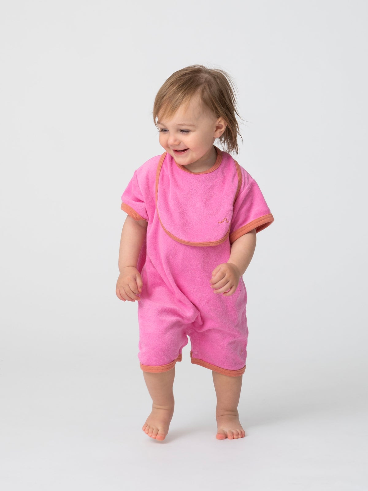 人気のパイルシリーズから新色が登場。ロンパースはタンクとTシャツ型の2型に加え同デザインのビブも登場します。ロンパースは1枚でスタイリングが完成する仕様にこだわり、シルエットをあえてまっすぐのデザインにすることで赤ちゃんの丸みを引き立てながらも動きを妨げないサイズバランスに。赤ちゃんにとっての快適さとデイリーにもお出かけ使いにも活躍する一着です。おそろいのビブは、ロンパースと同じふんわりとした肌触りのパイル地をもとに、ミルクやよだれをしっかりとキャッチできるよう大きめサイズに仕上げました。ロンパースとおそろいでの着用がおすすめ。