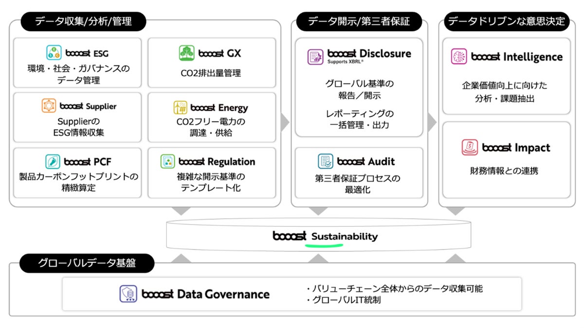 シェアNo.1*1のサステナビリティERP 「booost Sustainability」は、国際開示基準に準拠し、環境、社会、ガバナンス等のデータポイントに対応したサステナビリティ関連財務情報の収集、集計の自動化、およびリアルタイムでのモニタリングを可能とする統合型SXプラットフォームです。