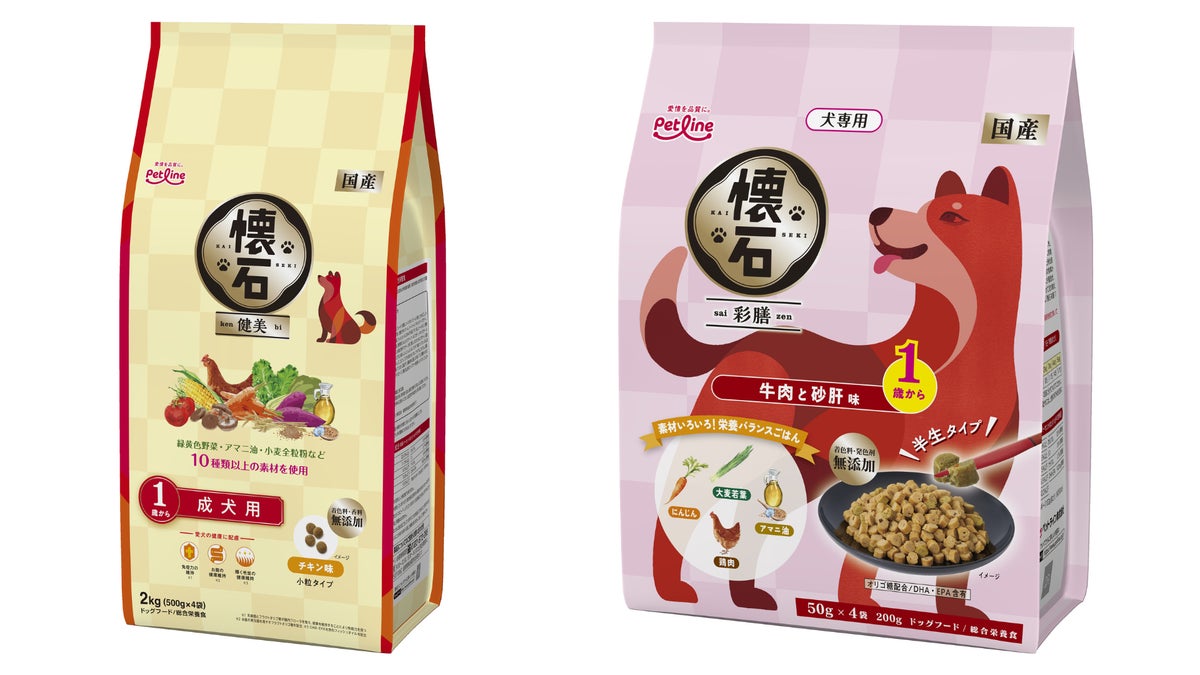 国産ペットフードメーカーのペットライン株式会社(本社 神奈川県横浜市/代表取締役社長 小沼 亮)は、2026年3月2日(月)にドッグフードブランドとして新しく、オメガ3脂肪酸が豊富なアマニ油、食物繊維が豊富な小麦全粒粉など、9~10種類以上のこだわり素材をひと粒にギュッと閉じ込めた「懐石 健美(けんび)」および国産鶏肉を使用したしっとり食感の半生ごはんで愛犬の健康に配慮し、機能性原料も配合した「懐石 彩膳(さいぜん)」を発売します。