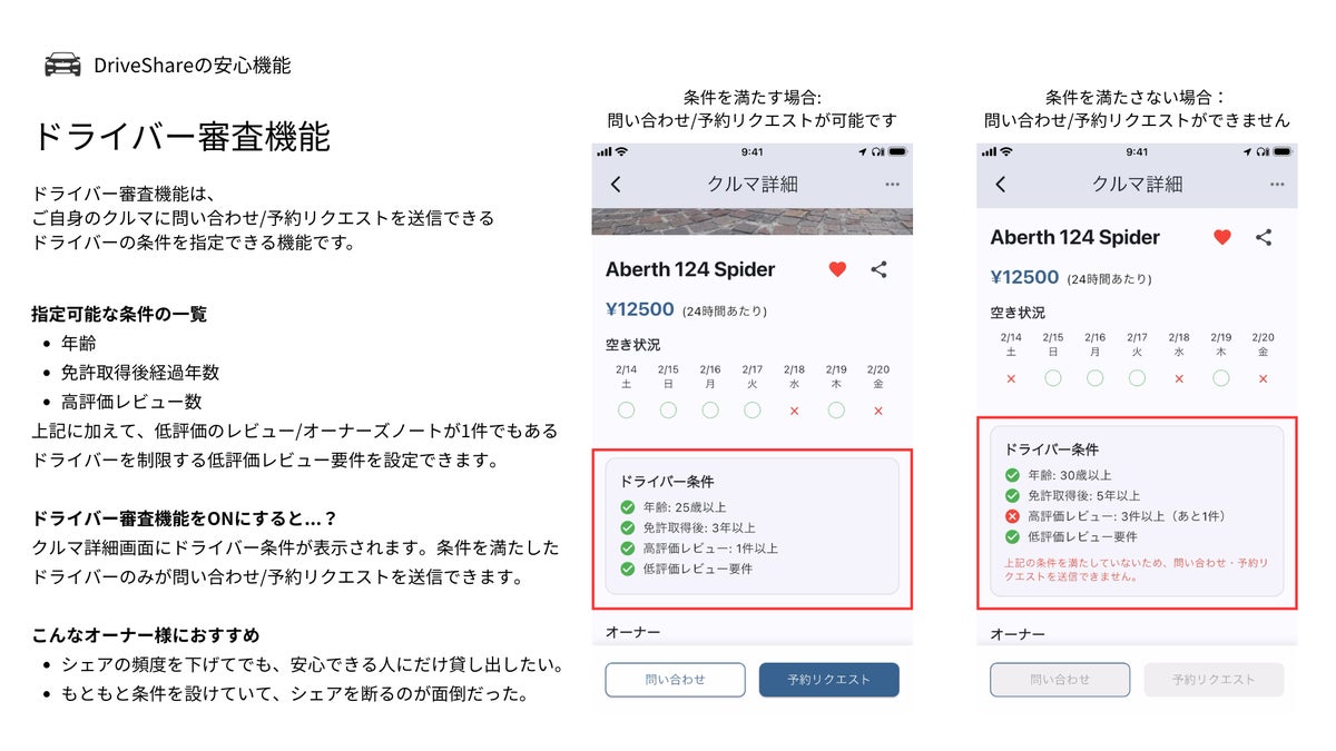 ご自身のおクルマに対して問い合わせ/予約リクエストを送信できるドライバーの条件を指定することができる機能です。「シェアによる維持費の削減は魅力だけど、実績のないドライバーに貸すのは心配」という方向けに、年齢や過去のレビュー実績等の条件をあらかじめ定めることができます。