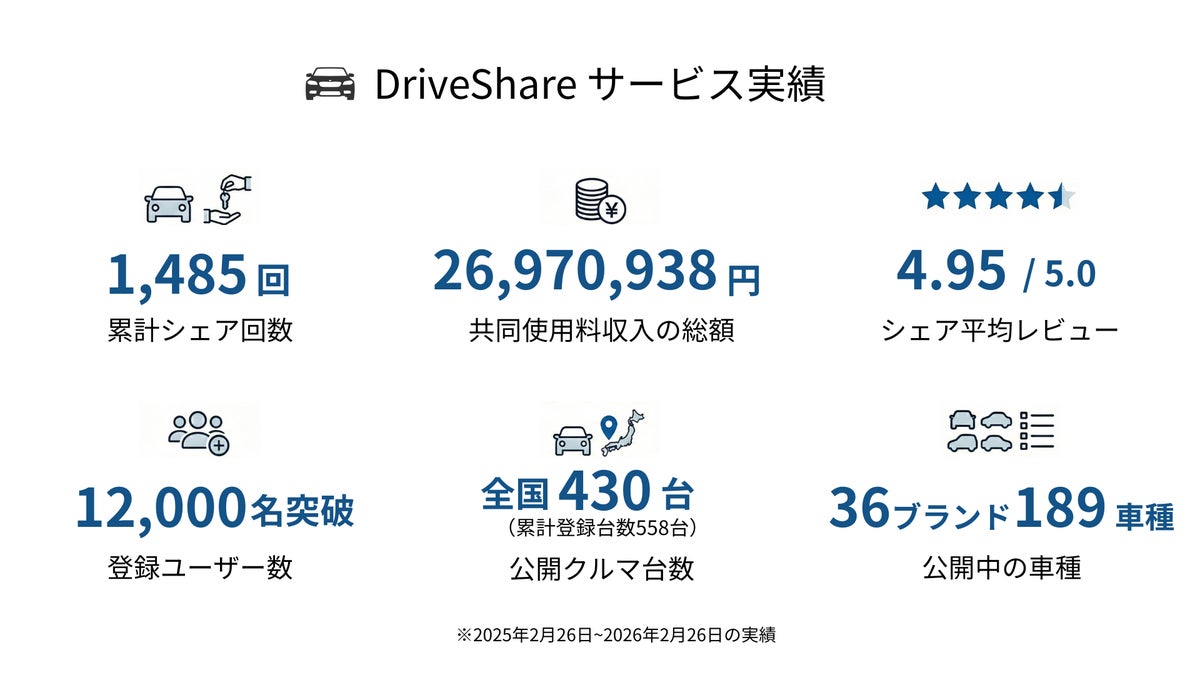 2025年2月のリリース以来、オーナー・ドライバーの皆様にご協力いただきながら着実にシェアの実績を重ねてまいりました。結果として、ユーザー数1万2,000名、公開車両台数430台という規模まで成長しながら平均レビュー4.95という高い満足度を実現することができました。ご登録いただいているオーナーの皆様、ならびにご利用いただいているドライバーの皆様に運営一同、心から感謝申し上げます。