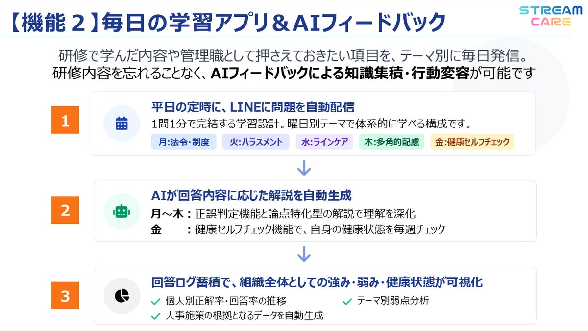 こうした課題を背景に開発したのが、AIトレーニングツール「フェムケアプラス|STREAM CARE」で、当社が提供する「フェムケアプラス|トータルケア」の一環として、管理職の実践力向上を支援します。本サービスは、管理職が実際に直面しやすい職場場面をAIが提示し、音声による対応練習とフィードバックを通じて、女性部下への適切な関わり方を実践的に学ぶことができる仕組みです。従来の座学研修では定着しにくかった現場マネジメントスキルを、日常的なトレーニングとして継続的に習得できる点が特長です。
