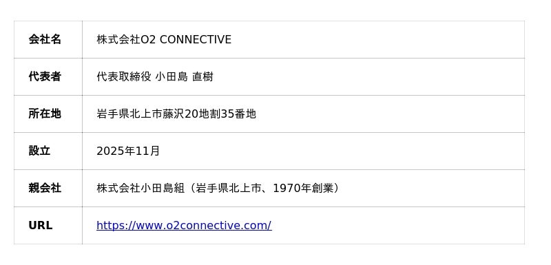株式会社O2 CONNECTIVE(本社:岩手県北上市、代表取締役:小田島 直樹、以下「当社」)は、社員の思考特性をAIが分析し、上司・同僚・部下それぞれに対する具体的なコミュニケーション方法をリアルタイムで提案する組織支援サービス「O2 CONNECTIVE(オーツーコネクティブ)」を2026年2月2日より正式に提供開始いたしました。当社は、岩手県北上市で1970年に創業した建設会社 株式会社小田島組の社内ベンチャーとして設立されました。
