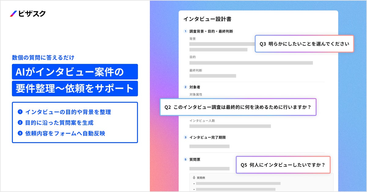 ビザスク、AIが専門家インタビューの要件整理と実施後のインサイト抽出をサポートする新機能を提供開始