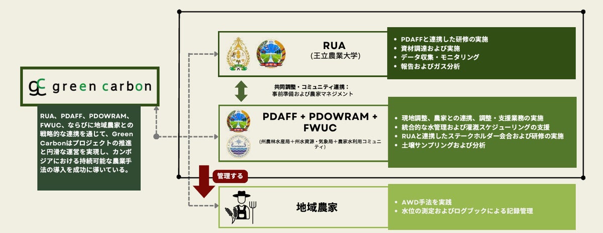 本プロジェクトで得たデータを、カンボジア国内の変革および持続可能な運営へとつなげるため、Green Carbonは、研究機関、現地パートナーと連携し統合型パートナーシップモデルを構築しました。Green Carbonは、プロジェクト全体のマネジメント、農家向け研修、カーボンクレジット創出を主導し、以下の機関とパートナーシップを締結しプロジェクトを推進しました。