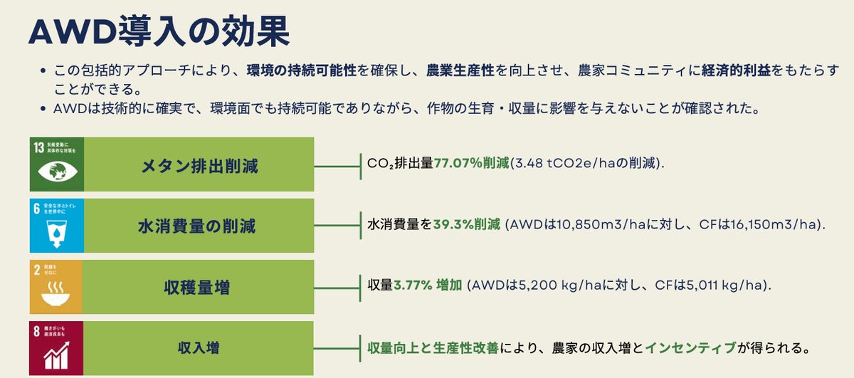 本プロジェクトでは、間断灌漑(Alternate Wetting and Drying:AWD)を水田圃場に導入し、「持続可能な農法は収量を犠牲にする」という従来の認識を覆しました。従来の連続湛水(CF)と比較した結果、下記、プラスの影響が確認されました。