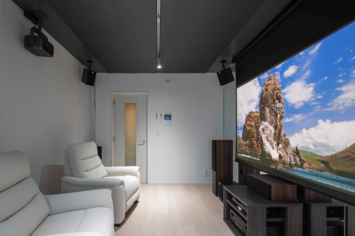 最新鋭の音響環境でホームシアターを楽しめる空間です。100インチスクリーン(4K対応電動昇降スクリーン)、 4Kトリプルレーザープロジェクター「JMGO N1S Ultra」のほか、デンマークのメーカー「DALI」製ハイエンドモデル「OBERON/OPTICON/シリーズ」や、DENON製ハイエンドAVアンプ「AVR-X4500H」(IMAX Enhanced対応)をはじめとしたアンプを天井4本、床6本(重低音1本含む)計10基設置し、360度全方位からの音響移動を実現させるDolbyAtmos 5.1.4ch(計9.1ch)を構成しています。