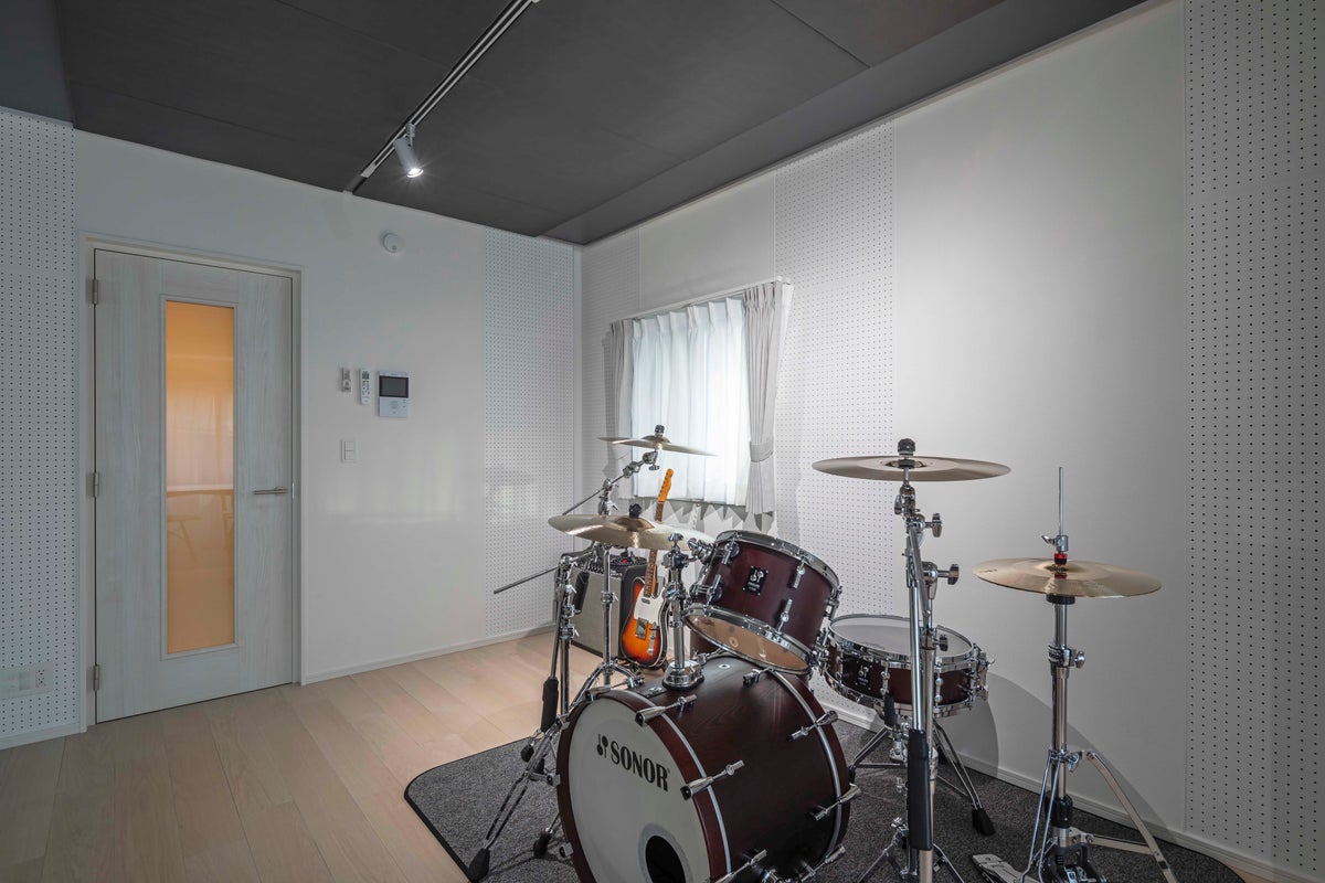■楽器演奏体験モデルルーム楽器演奏時の心地良さを体験できるモデルルームです。室内にご用意したドラムセット(SONOR Prolite Series)、ギターアンプ(Fender Twin Reverb)、エレキギター(Fender Telecaster)や、ご自身で持参された楽器で音を鳴らすことにより、どのように反響するかを肌で感じられます。また、演奏しながら隣室のリアルタイム映像をチェックし、ご自身の演奏音が本当に漏れていないかをご確認いただけます。