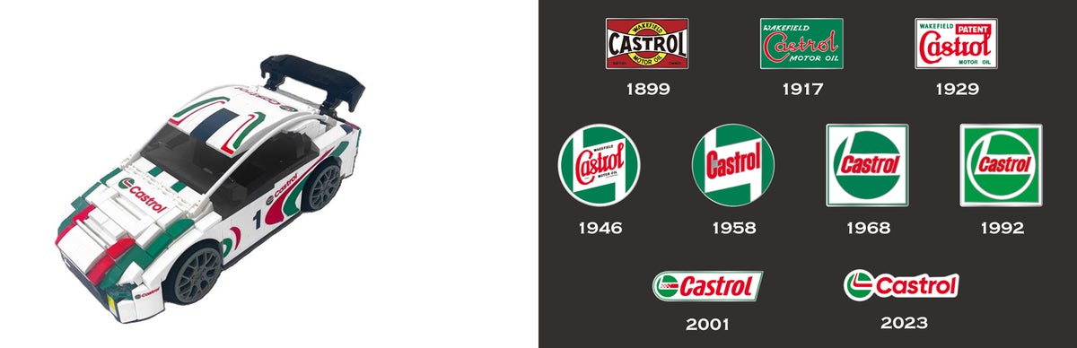 左:カストロール デカール付き 自動車型ブロック模型 、 右:カストロール歴代ロゴピンズコレクション