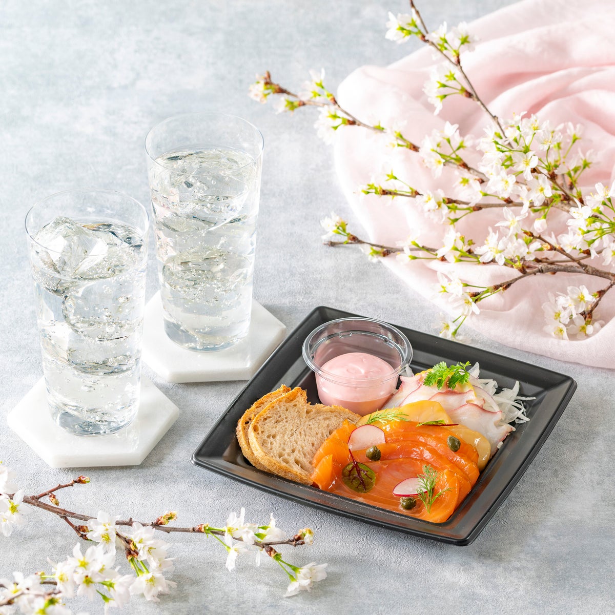 まろやかなスモークトラウトサーモン、燻製帆立と蛸に、桜香る自家製マヨネーズを添えました。ジン特有のキレと優しい甘みをほのかに残すROKU〈六〉のジンソーダとの相性が抜群です。ROKU〈六〉のペアリングが楽しめるセットメニューで、心弾むひとときをお過ごしください。