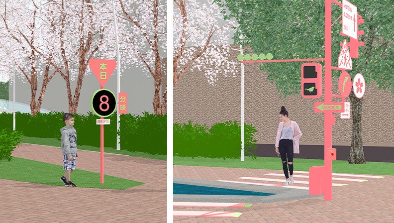 信号機を模したオブジェは、ボタンを押すと歩行者信号がウグイスに変わり、スピーカーから「ホーホケキョ」と春らしい音色が響きます。“触る・聞く・見つける”仕掛けを辿りながら、春の散策をお楽しみください。