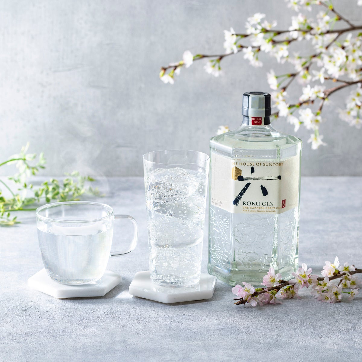 桜花、桜葉、煎茶、玉露、山椒、柚子。日本ならではの6種のボタニカルを使用し、繊細な職人技で完璧な香味バランスを追求したスムースな口当たりと上品な味わいが魅力の「ROKU〈六〉」。ソーダ割りは香りを感じながら、すっきり味わえます。また、より香りが引き立つお湯割りでは、柔らかい味わいに癒されながら、まったりとお愉しみいただけます。