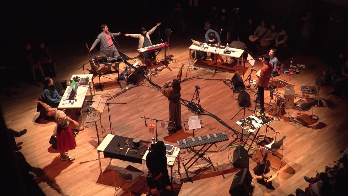 本作「particle(粒子)」は、粒子が形を変えながら空気中を舞う様子を描いた音楽作品である。正面に立つ奏者から生み出されるヴァイオリンの音を、電子エフェクトを介してリアルタイムに変容・拡張させ、見えない粒子の運動を立体的に感じられるように構築した。スピーカーを複数箇所に配置することにより、音の拡散や移動を空間的に演出し、見えない動きを聴覚によって体験できる構造を目指した。