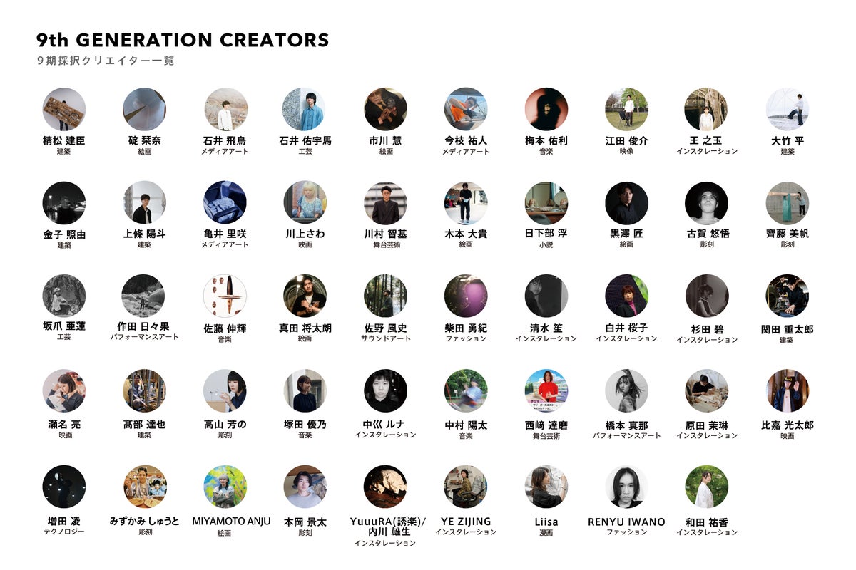 棈松 建臣(建築)|碇 栞奈(絵画 / インスタレーション)|石井 飛鳥(メディアアート / 実験美学)|石井 佑宇馬(工芸)|市川 慧(絵画)|今枝 祐人(メディアアート / 詩 / 短歌)|岩野 蓮祐(ファッション)|梅本 佑利(音楽)|江田 俊介(映像 / 建築)|王 之玉(インスタレーション)|大竹 平(建築)|金子 照由(建築)|上條 陽斗(建築 / コンピューテーショナルファブリケーション)|亀井 里咲(メディアアート / キネティックエッセイ)|川上さわ(映画 / 劇映画 / 日記映画)|川村 智基(舞台芸術 / 会話劇 / パフォーマンス)|木本 大貴(絵画 / メディアアート / パフォーマンス / インスタレーション)|日下部 浮(小説 / 現代美術)|黒澤 匠(絵画)|古賀 悠悟(彫刻 / インスタレーション / 都市)|齊藤 美帆(彫刻)|坂爪 亜蓮(工芸 / 金属造形)|作田 日々果(パフォーマンスアート / 実演)|佐藤 伸輝(音楽)|真田 将太朗(絵画)|佐野 風史(音楽 / サウンドアート / テクノロジー)|柴田 勇紀(ファッション / 衣服 / インスタレーション)|清水 笙(インスタレーション)|白井 桜子(インスタレーション)|杉田 碧(インスタレーション / 映像インスタレーション)|関田 重太郎(建築 / 企画設計)|瀬名 亮(映画)|高部 達也(建築 / インフラ)|高山 芳の(彫刻 / キネティックアート / デザイン)|塚田 優乃(音楽 / 作曲)|中巛 ルナ(インスタレーション)|中村 陽太(音楽)|西崎 達磨(舞台芸術)|橋本 真那(パフォーマンスアート)|原田 茉琳(インスタレーション)|比嘉 光太郎(映画 / ホラー・オカルト映画 / オカルト研究家)|増田 凌(テクノロジー)|みずかみ しゅうと(彫刻)|MIYAMOTO ANJU(絵画)|本岡 景太(彫刻)|YuuuRA(誘楽)・内川雄生(インスタレーション / 書 / 現代書道)|YE ZIJING(インスタレーション)|Liisa(漫画 / インスタレーション)|和田 祐香(インスタレーション)