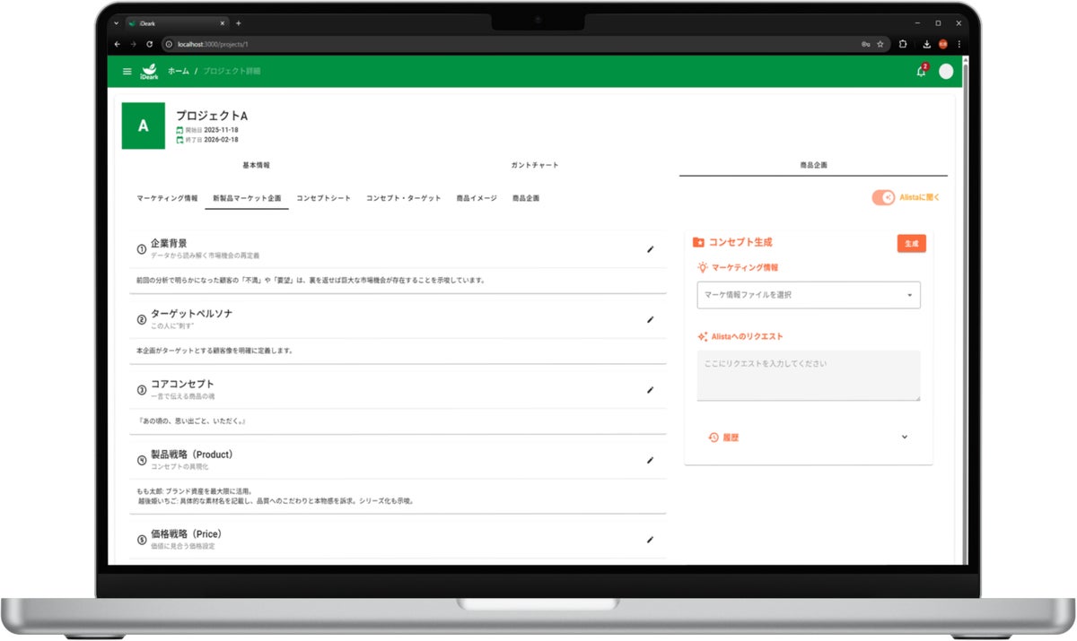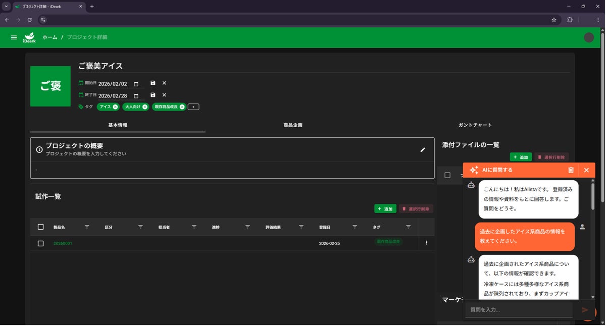 ALISTAは、iDearkに付随する食品領域に特化したAIエージェントです。iDearkにて実施する商品開発の検討プロセスに伴走し、以下の機能を提供します。・過去情報の要約