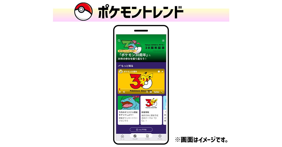 ポケモン30周年関連ニュースが一目でわかる「ポケモンタブ」と、毎月ポケモンに関するトレンド情報を紹介する「ポケモントレンド」が「Yahoo! JAPAN」アプリに登場します。さらに、「ポケモンタブ」と「ポケモントレンド」では、これまでの『ポケットモンスター』シリーズのパッケージを飾るポケモンがデザインされたオリジナルスマホ壁紙もダウンロードできます。壁紙は毎月異なるデザインを公開予定です。