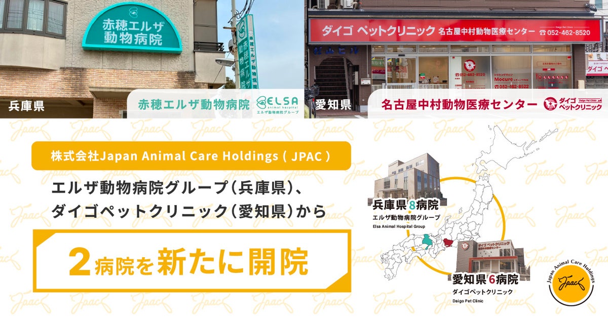株式会社Japan Animal Care Holdings(以下、JPAC)では、グループに属するエルザ動物病院グループ(兵庫県)、ダイゴペットクリニック(愛知県)において、新たに2病院が開院いたしました。